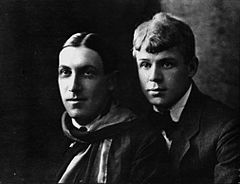 In 1915, exasperated with the lack of interest in his work in Moscow, Yesenin moved to Petrograd. He arrived at the city on 8 March and the next day met Alexander Blok at his home, to read him poetry. He received a warm welcome and soon became acquainted with fellow-poets Sergey Gorodetsky, Nikolai Klyuev and Andrei Bely and well known in literary circles. Blok was especially helpful in promoting Yesenin's early literary career, describing him as "a gem of a peasant poet"[13] and his verse as "fresh, pure and resounding", even if "wordy".[14] The same year he joined the Krasa (Beauty) group of peasant poets which included Klyuyev, Gorodetsky, Sergey Klychkov and Alexander Shiryayevets, among others.[9] In his 1925 autobiography Yesenin said that Bely gave him the meaning of form while Blok and Klyuev taught him lyricism.[15] It was Klyuyev who introduced Yesenin to the publisher Averyanov, who in early 1916 released his debut poetry collection Radunitsa which featured many of his early spiritual-themed verse. "I would have eagerly relinquished some of my religious poems, large and small, but they make sense as an illustration of poets' progress towards the revolution," he would later write.[9] Yesenin and Klyuyev maintained close and intimate[16] friendship which lasted several years.[7][17]