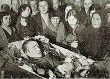 Yesenin supported the February Revolution. "If not for [it], I might have withered away on useless religious symbolism," he wrote later.[9] He greeted the rise of the Bolsheviks too. "In the Revolution I was all on the side of the October, even if perceiving everything in my own peculiar way, from a peasant's standpoint," he remembered in his 1925 autobiography.[9] Later he criticized the Bolshevik rule, in such poems as "The Stern October Has Deceived Me". "I feel very sad now, for we are going through such a period in [our] history when human individuality is being destroyed, and the approaching socialism is totally different from the one I was dreaming of," he wrote in an August 1920 letter to his friend Yevgeniya Livshits.[19] "I never joined the RKP, being further to the left than them," he maintained in his 1922 autobiography.[7]