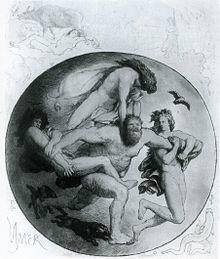 As the verbal battle continues, a few more exchanges directly refer to or may allude to Ymir. Odin asks what ancient jötun is the eldest of "Ymir's kin", and Vafþrúðnir responds that long, long ago it was Bergelmir, who was Þrúðgelmir's son and Aurgelmir's grandson. In the next stanza Odin asks where Aurgelmir came from so long ago, to which Vafþrúðnir responds that venom dropped from Élivágar, and that these drops grew until they became a jötunn, and from this being descends the jötnar. Finally, Odin asks how this being begat children, as he did not know the company of a female jötunn, to which Vafþrúðnir responds that from beneath the ancient jötunn's armpits together a girl and a boy grew, and his feet together produced a six-headed jötunn.[8]