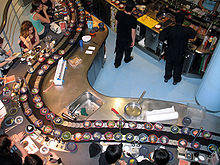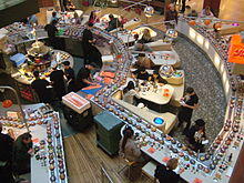 YO! Sushi specialises in delivering sushi to customers using the Japanese style 'kaiten' conveyor belt method.[9][10][11] In each restaurant various sushi dishes and other Japanese cooked foods are prepared in a theater style kitchen in plain view of customers and then set on the thin conveyor belt.[11]