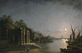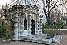 The mansions facing in the Strand were built there partly because they had direct access from their rear gardens to the River Thames, then a much-used transport artery. The surviving York Watergate (also known as Buckingham Watergate), built by George Villiers, 1st Duke of Buckingham in about 1626 as a ceremonial landing stage on the river, is now marooned 150 yards (137 m) from the river, within the Embankment Gardens, due to substantial riverside land reclamation following the construction of the Thames Embankment. With the Banqueting House it is one of the few surviving reminders in London of the Italianate court style of King Charles I. Its rusticated design in a Serlian manner has been attributed to Sir Balthazar Gerbier,[6] to Inigo Jones himself[7] and to the sculptor and master-mason Nicholas Stone.[8] The design is modelled closely on that of the Medici Fountain in the Jardin du Luxembourg in Paris.[9] It was restored in the 1950s.