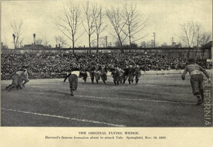 In 1892, during a game against Yale, Harvard fan and student Lorin F. Deland first introduced the flying wedge as a kickoff play. Two five man squads would line up about 25 yards behind the kicker, only to converge in a perfect flying wedge running downfield, where Harvard was able to trap the ball and hand it off to the speedy All-American Charley Brewer inside the wedge. Despite their effectiveness, the flying wedge, "V-trick formation" and other tactics which involved interlocking interference, were outlawed in 1905 through the efforts of the rule committee led by Parke H. Davis, because of its contribution to serious injury.[9] Non-interlocking interference remains a basic element of modern American football, with many complex schemes being developed and implemented over the years, including zone blocking and pass blocking.