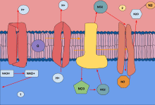 English: The model above shows the process of anaerobic respiration through denitrification, which uses nitrogen (in the form of nitrate, NO3−) as the electron acceptor. NO3− goes through respiratory dehydrogenase and reduces through each step from the ubiquinose through the bc1 complex through the ATP synthase protein as well. Each reductase loses oxygen through each step so that the final product of anaerobic respiration is N2.