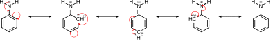 The pyramidalization angle between the C–N bond and the bisector of the H–N–H angle is 142.5°.[8] (For comparison, in more strongly pyramidal methylamine, this value is ~125°, while a planar nitrogen like that of formamide has an angle of 180°.) The C−N distance is also correspondingly shorter. In aniline, the C−N bond length is 1.41 Å,[9] compared to 1.47 Å for cyclohexylamine,[10] indicating that there is partial π-bonding between N and C.[11]