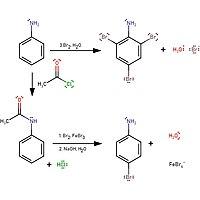 If bromine water is added to aniline, the bromine water is decolourised and a white precipitate of 2,4,6-tribromoaniline is formed. To generate the mono-substituted product, a protection with acetyl chloride is required: