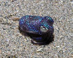 In many animals of the deep sea, including several squid species, bacterial bioluminescence is used for counterillumination camouflage, in which the animal matches the overhead environmental light as seen from below.[7] In these animals, photoreceptors control the illumination to match the brightness of the background.[7] These light organs are usually separate from the tissue containing the bioluminescent bacteria. However, in one species, Euprymna scolopes, the bacteria are an integral component of the animal's light organ.[8]