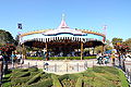 A carousel (American English: from French carrousel and Italian carosello), roundabout (British English),[1] or merry-go-round, is a type of amusement ride consisting of a rotating circular platform with seats for riders. The "seats" are traditionally in the form of rows of wooden horses or other animals mounted on posts, many of which are moved up and down by gears to simulate galloping, to the accompaniment of looped circus music. This leads to one of the alternative American names, the galloper (however see ‘direction of rotation’ below). Other popular names are jumper, horseabout, horse tornado and flying horses.
