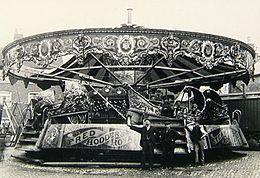 Soon afterwards, English engineer Frederick Savage began to branch out of agricultural machinery production into the construction of fairground machines, swiftly becoming the chief innovator in the field. Savage's fairground machinery was exported all over the world.[8] By 1870, he was manufacturing carousels with Velocipedes (an early type of bicycle) and he soon began experimenting with other possibilities, including a roundabout with boats that would pitch and roll on cranks with a circular motion, a ride he called 'Sea-on-Land'.[9]