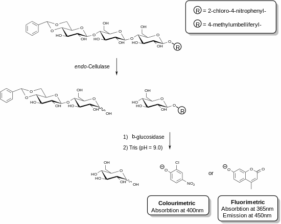 Recently, new reagents have been developed that allow for the specific measurement of endo-cellulase.[25][26] These methods involve the use of functionalised oligosaccharide substrates in the presence of an ancillary enzyme. In the example shown, a cellulase enzyme is able to recognise the trisaccharide fragment of cellulose and cleave this unit. The ancillary enzyme present in the reagent mixture (β-glucosidase) then acts to hydrolyse the fragment containing the chromophore or fluorophore. The assay is terminated by the addition of a basic solution that stops the enzymatic reaction and deprotonates the liberated phenolic compound to produce the phenolate species. The cellulase activity of a given sample is directly proportional to the quantity of phenolate liberated which can be measured using a spectrophotometer. The acetal functionalisation on the non-reducing end of the trisaccharide substrate prevents the action of the ancillary β-glucosidase on the parent substrate.