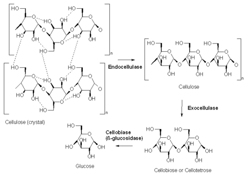 - Cellobiases (EC 3.2.1.21) or beta-glucosidases hydrolyse the exocellulase product into individual monosaccharides.