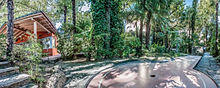 The first standardized minigolf courses to enter commercial mass-production were the Thistle Dhu ("This'll Do") course 1916 in Pinehurst, North Carolina, and the 1927 Tom Thumb patent of Garnet Carter from Lookout Mountain, Tennessee. Thomas McCullough Fairbairn, a golf fanatic, revolutionized the game in 1922 with his formulation of a suitable artificial green—a mixture of cottonseed hulls, sand, oil, and dye. With this discovery, miniature golf became accessible everywhere; by the late 1920s there were over 150 rooftop courses in New York City alone and tens of thousands across the United States.[5] This American minigolf boom of early 20th century came to an end during the economic depression in the late 1930s. Nearly all minigolf courses in the United States were closed and demolished before the end of the 1930s.[6] A rare surviving example from this period is the Parkside Whispering Pines Miniature Golf Course located near Rochester, New York, and listed on the National Register of Historic Places in 2002.[7]