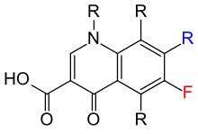 The basic pharmacophore, or active structure, of the fluoroquinolone class is based upon the quinoline ring system.[70] Various substitutions made to the quinoline ring resulted in the development of numerous fluoroquinolone drugs. The addition of the fluorine atom at C-6 distinguishes the successive-generation fluoroquinolones from the first-generation quinolones, although examples are known that omit the atom while retaining antibacterial activity.[52]