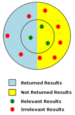 The diagram at right represents a low-precision, low-recall search. In the diagram the red and green dots represent the total population of potential search results for a given search. Red dots represent irrelevant results, and green dots represent relevant results. Relevancy is indicated by the proximity of search results to the center of the inner circle. Of all possible results shown, those that were actually returned by the search are shown on a light-blue background. In the example only 1 relevant result of 3 possible relevant results was returned, so the recall is a very low ratio of 1/3, or 33%. The precision for the example is a very low 1/4, or 25%, since only 1 of the 4 results returned was relevant.[3]