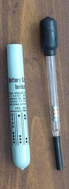 The state of charge of a lead-acid battery can be estimated from the density of the sulfuric acid solution used as electrolyte. A hydrometer calibrated to read specific gravity relative to water at 60 °F (16 °C) is a standard tool for servicing automobile batteries. Tables are used to correct the reading to the standard temperature. Hydrometers are also used for maintenance of wet-cell nickel-cadmium batteries to ensure the electrolyte is of the proper strength for the application; for this battery chemistry the specific gravity of the electrolyte is not related to the state of charge of the battery.