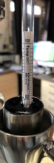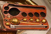 A saccharometer is a hydrometer used for determining the amount of sugar in a solution, invented by Thomas Thomson.[11] It is used primarily by winemakers and brewers,[12] and it can also be used in making sorbets and ice-creams.[13] The first brewers' saccharometer was constructed by Benjamin Martin (with distillation in mind), and initially used for brewing by James Baverstock Sr in 1770.[14] Henry Thrale adopted its use and it was later popularized by John Richardson in 1784.[15]
