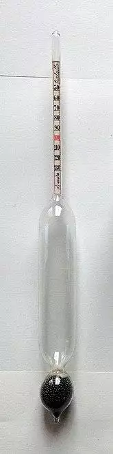It consists of a large weighted glass bulb with a thin stem rising from the top with calibrated markings. The sugar level can be determined by reading the value where the surface of the liquid crosses the scale. The higher the sugar content, the denser the solution, and thus the higher the bulb will float.