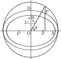 The parametric latitude can also be extended to a three-dimensional coordinate system. For a point P not on the reference ellipsoid (semi-axes OA and OB) construct an auxiliary ellipsoid which is confocal (same foci F, F′) with the reference ellipsoid: the necessary condition is that the product ae of semi-major axis and eccentricity is the same for both ellipsoids. Let u be the semi-minor axis (OD) of the auxiliary ellipsoid. Further let β be the parametric latitude of P on the auxiliary ellipsoid. The set (u,β,λ) define the ellipsoid coordinates.[4]:§4.2.2 These coordinates are the natural choice in models of the gravity field for a rotating ellipsoidal body.