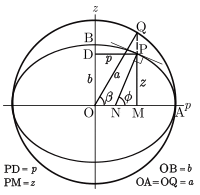 The alternative name arises from the parameterization of the equation of the ellipse describing a meridian section. In terms of Cartesian coordinates p, the distance from the minor axis, and z, the distance above the equatorial plane, the equation of the ellipse is: