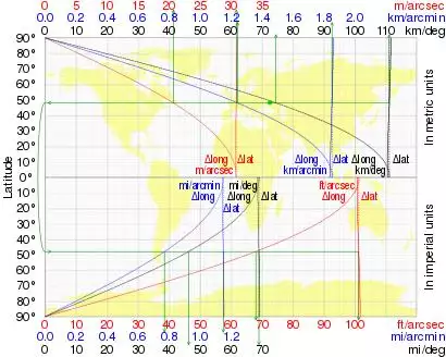 The following graph illustrates the variation of both a degree of latitude and a degree of longitude with latitude.