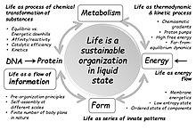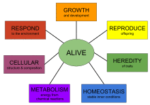 The definition of life has long been a challenge for scientists and philosophers, with many varied definitions put forward.[16][17][18] This is partially because life is a process, not a substance.[19][20][21] This is complicated by a lack of knowledge of the characteristics of living entities, if any, that may have developed outside of Earth.[22][23] Philosophical definitions of life have also been put forward, with similar difficulties on how to distinguish living things from the non-living.[24] Legal definitions of life have also been described and debated, though these generally focus on the decision to declare a human dead, and the legal ramifications of this decision.[25] As many as 123 definitions of life have been compiled.[26] One definition seems to be favored by NASA: “a self-sustaining chemical system capable of Darwinian evolution.”[27][28]