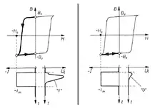 The term "core" comes from conventional transformers whose windings surround a magnetic core. In core memory, the wires pass once through any given core—they are single-turn devices. The properties of materials used for memory cores are dramatically different from those used in power transformers. The magnetic material for a core memory requires a high degree of magnetic remanence, the ability to stay highly magnetized, and a low coercivity so that less energy is required to change the magnetization direction. The core can take two states, encoding one bit. The core memory contents are retained even when the memory system is powered down (non-volatile memory). However, when the core is read, it is reset to a "zero" value. Circuits in the computer memory system then restore the information in an immediate re-write cycle.