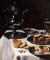 During the Puritan era of Oliver Cromwell, some sources claim mince pie eating was banned as a frivolous activity for 16 years, so mince pie making and eating became an underground activity; the ban was lifted in 1660, with the Restoration of the monarchy.[6] In the 17th century, Ben Jonson described a skilled pie cook by comparing the cook to a fortification builder who "...Makes citadels of curious fowl and fish" and makes "dry-ditches", "bulwark pies" and "ramparts of immortal crusts".[3] In Gervase Markham's 1615 book The English Huswife, there is a pie recipe that calls for "an entire leg of mutton and three pounds of suet..., along with salt, cloves, mace, currants, raisins, prunes, dates, and orange peel", which made a huge pie that could serve a large group.[11]