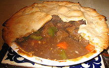 In the Medieval era, pies were usually savory meat pies made with "...beef, lamb, wild duck, magpie pigeon -- spiced with pepper, currants or dates".[8] Medieval cooks had restricted access to ovens due to their costs of construction and need for abundant supplies of fuel. Since pies could be easily cooked over an open fire, this made pies easier for most cooks to make. At the same time, by partnering with a baker, a cook could focus on preparing the filling. The earliest pie-like recipes refer to coffyns (the word actually used for a basket or box), with straight sealed sides and a top; open-top pies were called traps. The resulting hardened pastry was not necessarily eaten, its function being to contain the filling for cooking, and to store it, though whether servants may have eaten it once their masters had eaten the filling is impossible to prove.[9] The thick crust was so sturdy it had to be cracked open to get to the filling.[2] This may also be the reason why early recipes focus on the filling over the surrounding case, with this development leading to the use of reusable earthenware pie cases which reduced the use of expensive flour.[10] Medieval pie crusts were often baked first, to create a "pot" of baked dough with a removable top crust, hence the name pot pie.[6]