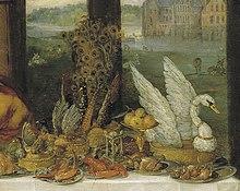 Pies in the 1400s included birds, as song birds at the time were a delicacy and protected by Royal Law. At the coronation of eight-year-old English King Henry VI (1422–1461) in 1429, "Partrich" and "Pecok enhakill" were served, alleged by some modern writers to consist of cooked peacock mounted in its skin on a peacock-filled pie. The expressions "eat crow" and "four and 20 blackbirds" are sayings from the era when crow and blackbirds were eaten in pies.[2] Cooked birds were frequently placed by European royal cooks on top of a large pie to identify its contents, leading to its later adaptation in pre-Victorian times as a porcelain ornament to release of steam and identify a good pie.[1] The apple pie was first referenced in writing in 1589, when the poet R. Green wrote "Thy breath is like the seeme of apple pies".[8]