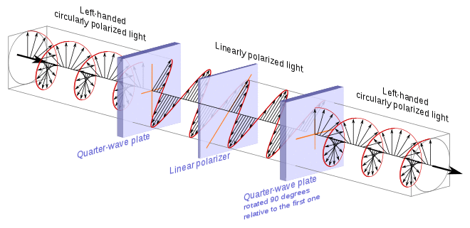 A homogeneous circular polarizer can be created by sandwiching a linear polarizer between two quarter-wave plates.[12] Specifically we take the circular polarizer described previously, which transforms circularly polarized light into linear polarized light, and add to it a second quarter-wave plate rotated 90° relative to the first one.