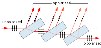 A more useful polarized beam can be obtained by tilting the pile of plates at a steeper angle to the incident beam. Counterintuitively, using incident angles greater than Brewster's angle yields a higher degree of polarization of the transmitted beam, at the expense of decreased overall transmission. For angles of incidence steeper than 80° the polarization of the transmitted beam can approach 100% with as few as four plates, although the transmitted intensity is very low in this case.[6] Adding more plates and reducing the angle allows a better compromise between transmission and polarization to be achieved.