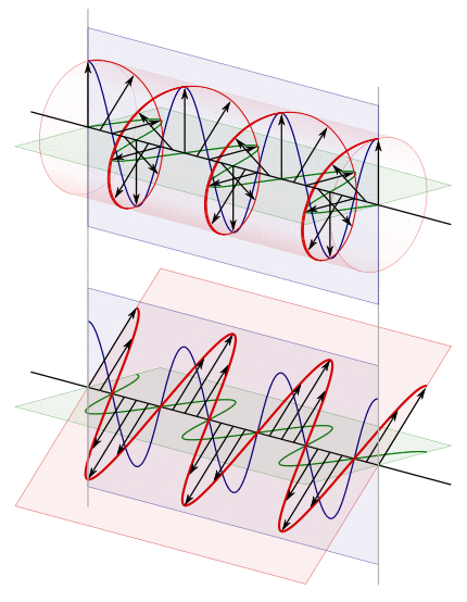 At the top of the illustration toward the right is the circularly polarized light after it leaves the wave plate. Directly below it, for comparison purposes, is the linearly polarized light that entered the quarter-wave plate. In the upper image, because this is a plane wave, each vector leading from the axis to the helix represents the magnitude and direction of the electric field for an entire plane that is perpendicular to the direction of travel. All the electric field vectors have the same magnitude indicating that the strength of the electric field does not change. The direction of the electric field however steadily rotates.