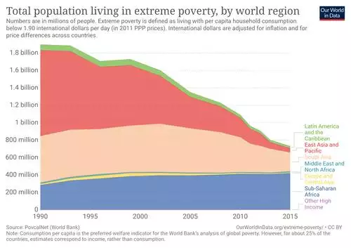 In Sub-Saharan Africa extreme poverty went up from 41 percent in 1981 to 46 percent in 2001,[81] which combined with growing population increased the number of people living in extreme poverty from 231 million to 318 million.[82] Statistics of 2018 shows population living in extreme conditions has declined by more than 1 billion in the last 25 years. As per the report published by the world bank on 19 September 2018 world poverty falls below 750 million.[83]