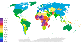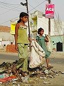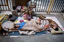 According to Chen and Ravallion, about 1.76 billion people in developing world lived above $1.25 per day and 1.9 billion people lived below $1.25 per day in 1981. In 2005, about 4.09 billion people in developing world lived above $1.25 per day and 1.4 billion people lived below $1.25 per day (both 1981 and 2005 data are on inflation adjusted basis).[59][60] The share of the world's population living in absolute poverty fell from 43% in 1981 to 14% in 2011.[61] The absolute number of people in poverty fell from 1.95 billion in 1981 to 1.01 billion in 2011.[62] The economist Max Roser estimates that the number of people in poverty is therefore roughly the same as 200 years ago.[62] This is the case since the world population was just little more than 1 billion in 1820 and the majority (84% to 94%[63]) of the world population was living poverty. The proportion of the developing world's population living in extreme economic poverty fell from 28 percent in 1990 to 21 percent in 2001.[61] Most of this improvement has occurred in East and South Asia.[64] In 2012 it was estimated that, using a poverty line of $1.25 a day, 1.2 billion people lived in poverty.[65] Given the current economic model, built on GDP, it would take 100 years to bring the world's poorest up to the poverty line of $1.25 a day.[66] UNICEF estimates half the world's children (or 1.1 billion) live in poverty.[67] The World Bank forecasted in 2015 that 702.1 million people were living in extreme poverty, down from 1.75 billion in 1990.[68] Extreme poverty is observed in all parts of the world, including developed economies.[69][70] Of the 2015 population, about 347.1 million people (35.2%) lived in Sub-Saharan Africa and 231.3 million (13.5%) lived in South Asia. According to the World Bank, between 1990 and 2015, the percentage of the world's population living in extreme poverty fell from 37.1% to 9.6%, falling below 10% for the first time.[71] During the 2013 to 2015 period, the World Bank reported that extreme poverty fell from 11% to 10%, however they also noted that the rate of decline had slowed by nearly half from the 25 year average with parts of sub-saharan Africa returning to early 2000 levels.[72][73] The World Bank attributed this to increasing violence following the Arab Spring, population increases in Sub-Saharan Africa, and general African inflationary pressures and economic malaise were the primary drivers for this slow down.[74][75] Many wealthy nations have seen an increase in relative poverty rates ever since the Great Recession, in particular among children from impoverished families who often reside in substandard housing and find educational opportunities out of reach.[76] It has been argued by some academics that the neoliberal policies promoted by global financial institutions such as the IMF and the World Bank are actually exacerbating both inequality and poverty.[77][78]
