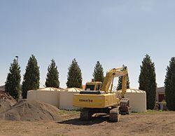Large polyethylene rainwater tanks being installed.