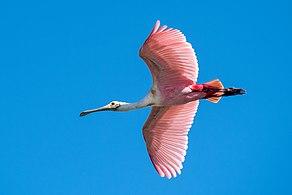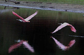 The roseate spoonbill (Platalea ajaja) is a gregarious wading bird of the ibis and spoonbill family, Threskiornithidae. It is a resident breeder in South America mostly east of the Andes, and in coastal regions of the Caribbean, Central America, Mexico, the Gulf Coast of the United States,[2][3] and from central Florida's Atlantic coast[4] at Merritt Island National Wildlife Refuge, adjoined with NASA Kennedy Space Center at least as far north as South Carolina's Myrtle Beach.[5]