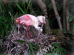 The roseate spoonbill nests in shrubs or trees, often mangroves, laying two to five eggs, which are whitish with brown markings.[11] Immature birds have white, feathered heads, and the pink of the plumage is paler. The bill is yellowish or pinkish.